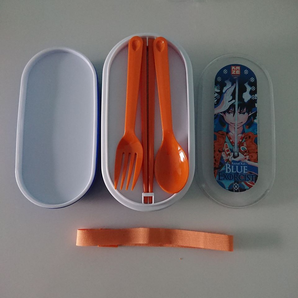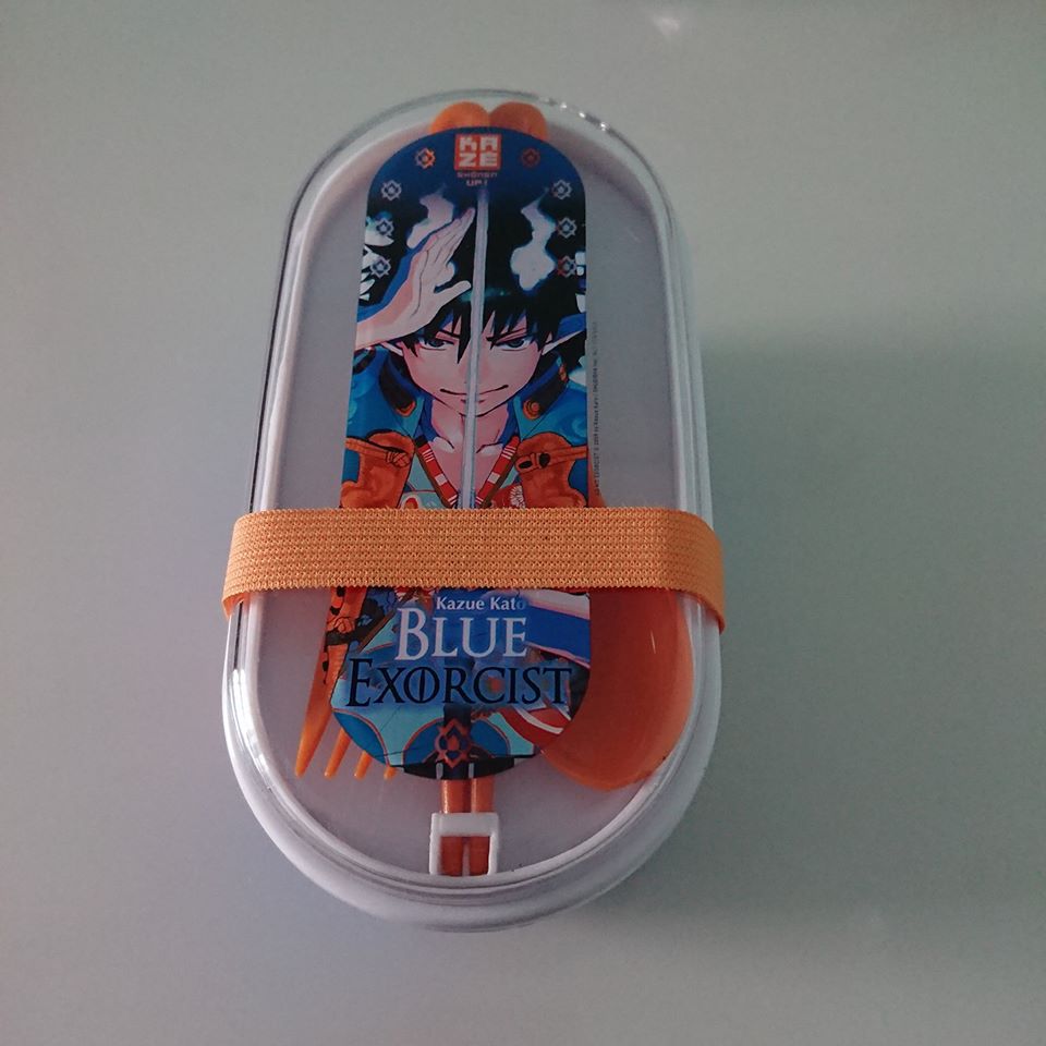 2-tier Ao no Exorcist Japanese Bentou Lunch Box. Comes with lid for each tier and enclosed set of spoon/fork/chopsticks. Elastic band to secure the box