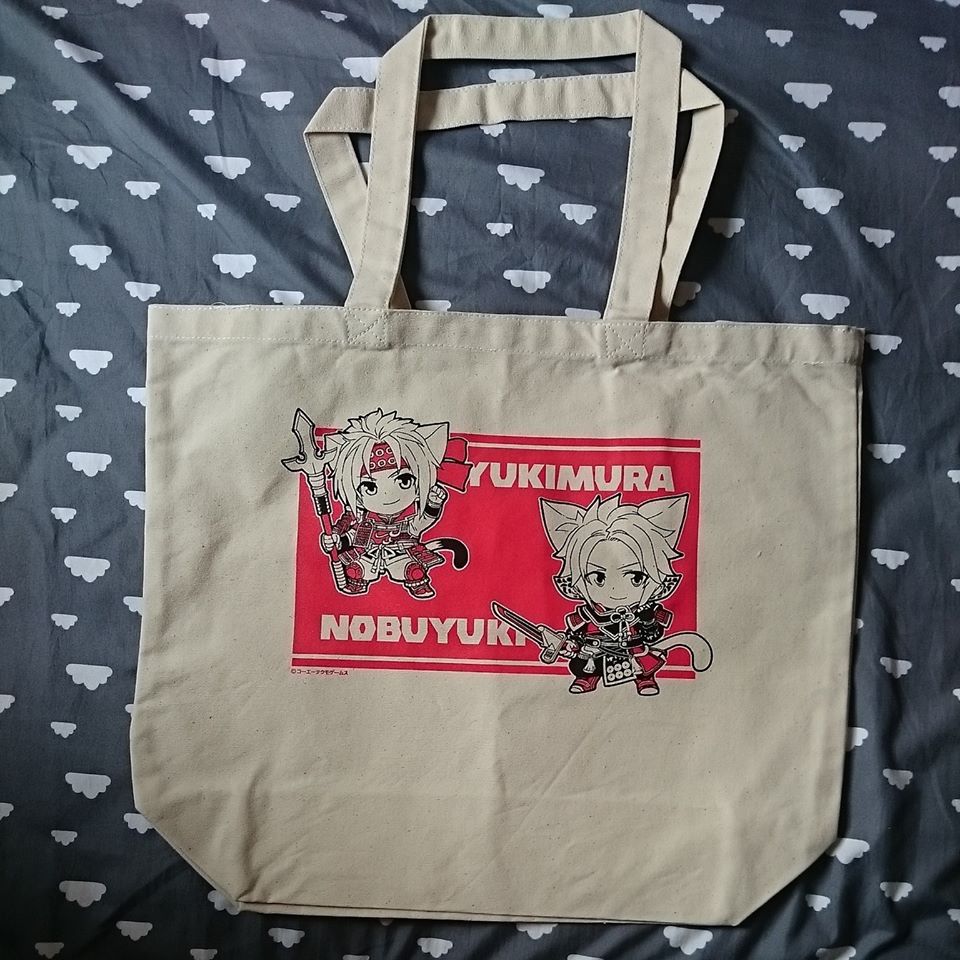 This is a Samurai Warriors Tote Bag in jumbo size featuring the Sanada brothers, Yukimura and Nobuyuki in their chibi neko form.