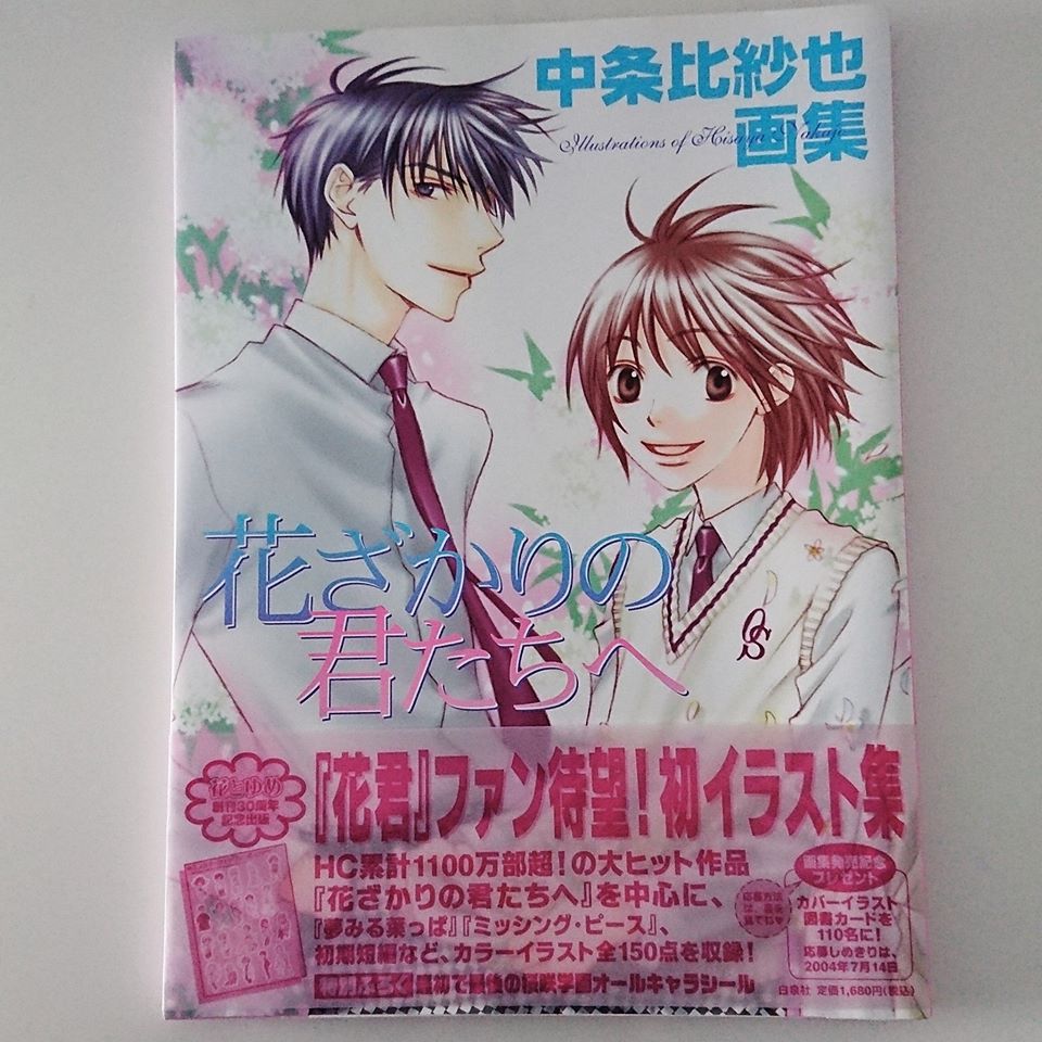 Hanazakari no Kimitachi e "For You in Full Blossom" Illustrated Art Book published by Shueisha and in Japanese language. This is a shoujo series published in the magazine Hana to Yume. It has a huge collection of coloured artwork illustrated by mangaka Hisaya Nakajo. Majority of the contents are coloured illustration featuring the characters Mizuki Ashiya, Izumi Sano, Shuichi Nakatsu and more. It also has some forewords and message from the author. This is the 1st edition print which comes with a special edition Ousaka-gakuen All Characters sticker seal. (Pic 5)
