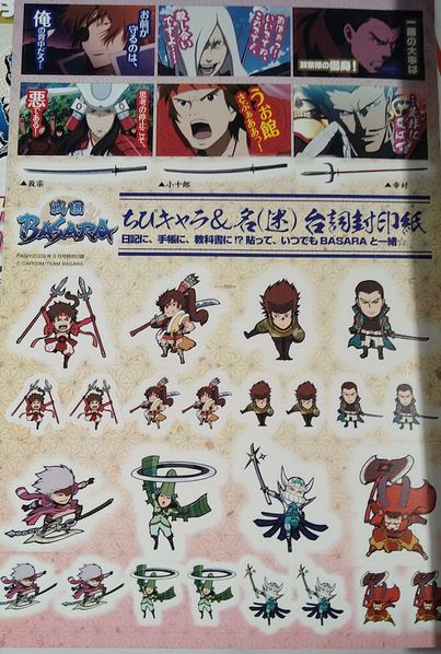 Sengoku Basara Stickers Seal Sheet, there are various designs stickers featuring Date Masamune, Sanada Yukimura, Ishida Mitsunari, Katakura Kokuro, Sarutobi Sasuke, Maeda Keiji, Uesugi Kenshin, Motochika Chosokabe, Motonari Mori, Tokugawa Ieyasu, Nobunaga