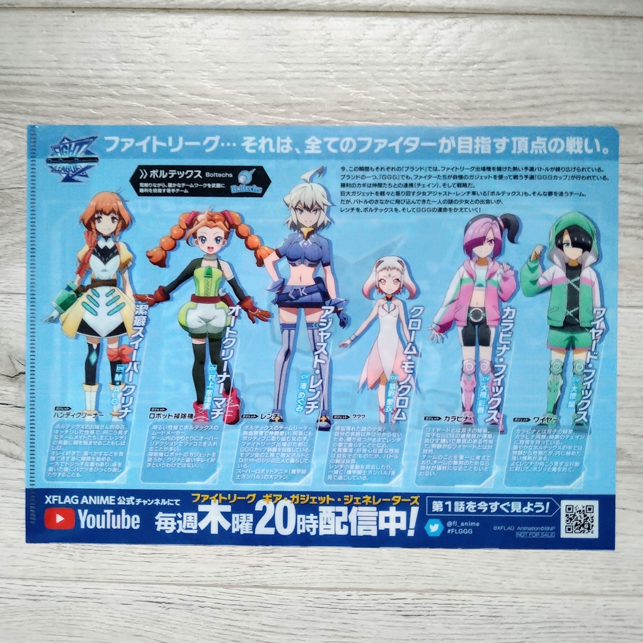 Anime adapted from Fight League, cellphone game from XFLAG available in Japan, Korea, Taiwan, Hong Kong, Macao, and Canada. It is a strategic game that is like board game or card game, which can attack using the arrow or create chain with the ally. There are five brands of fighters, and the anime will be focusing on GGG, a.k.a Gear Gadge Generation, which using Gadget fight.